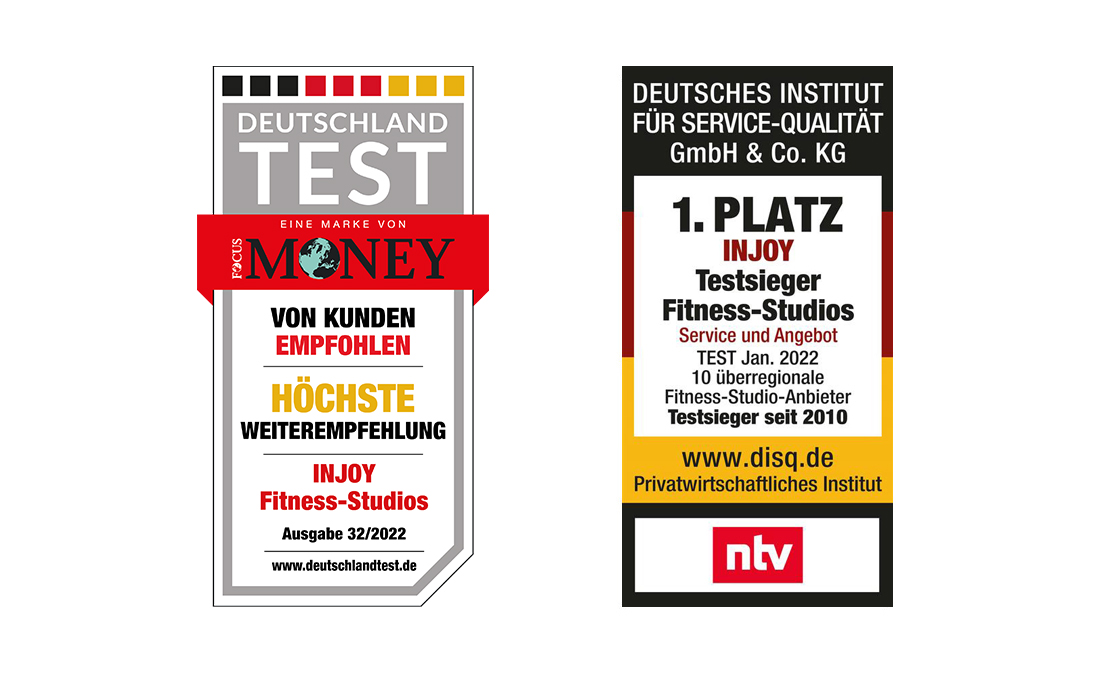 Wir haben uns zum wiederholten Male der Online-Befragung im Auftrag des Deutschen Instituts für Service Qualität (DISQ) und ntv den Wettbewerbern gestellt. Und auch 2024 wurde INJOY zur besten Fitnessstudio-Kette gekürt – und dies bereits zum achten Mal in Folge! INJOY schneidet dabei als Einziger mit dem Gesamturteil "sehr gut" ab. Sowohl im Bereich Beratung und Probetraining als auch hinsichtlich der Trainingsbedingungen und dem Angebot platzieren wir uns deutlich vor den Mitbewerbern.